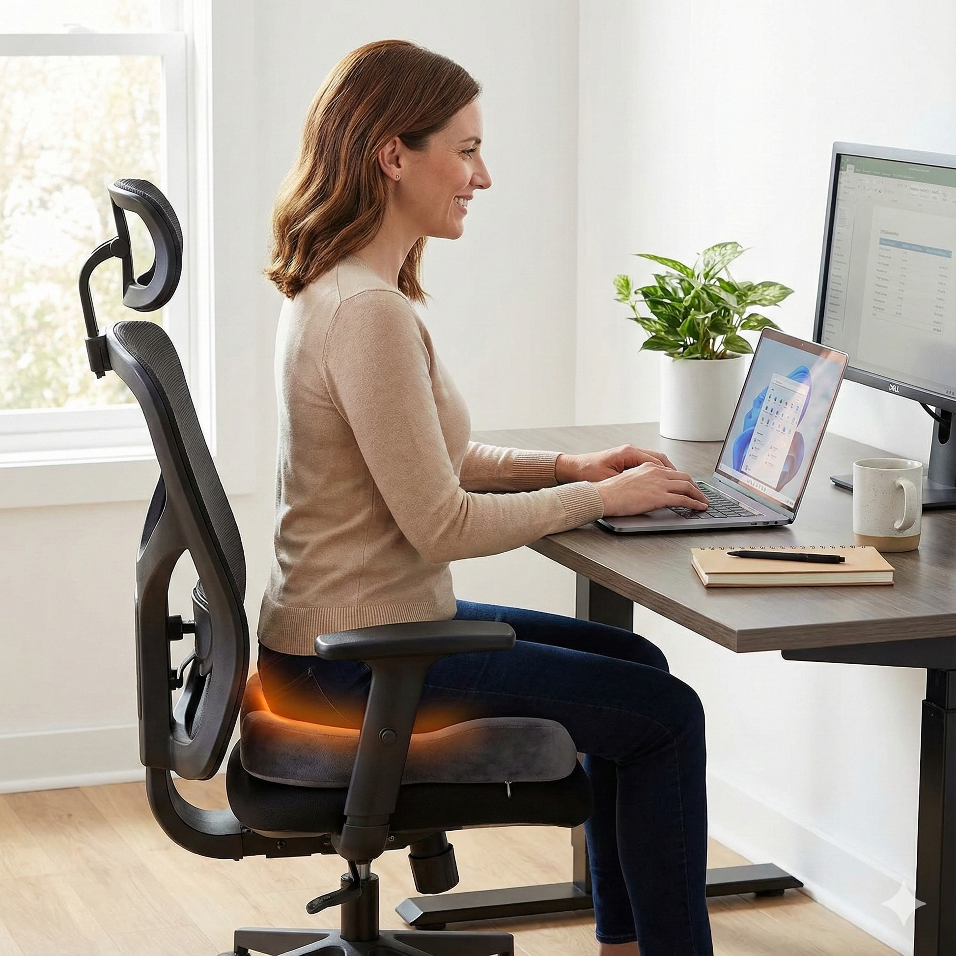 Menos presión en el coxis al sentarte: el recorte del cojín descarga la zona y el calor suave ayuda a que no se acumule tanta tensión en cada jornada de trabajo, conducción o sofá.
