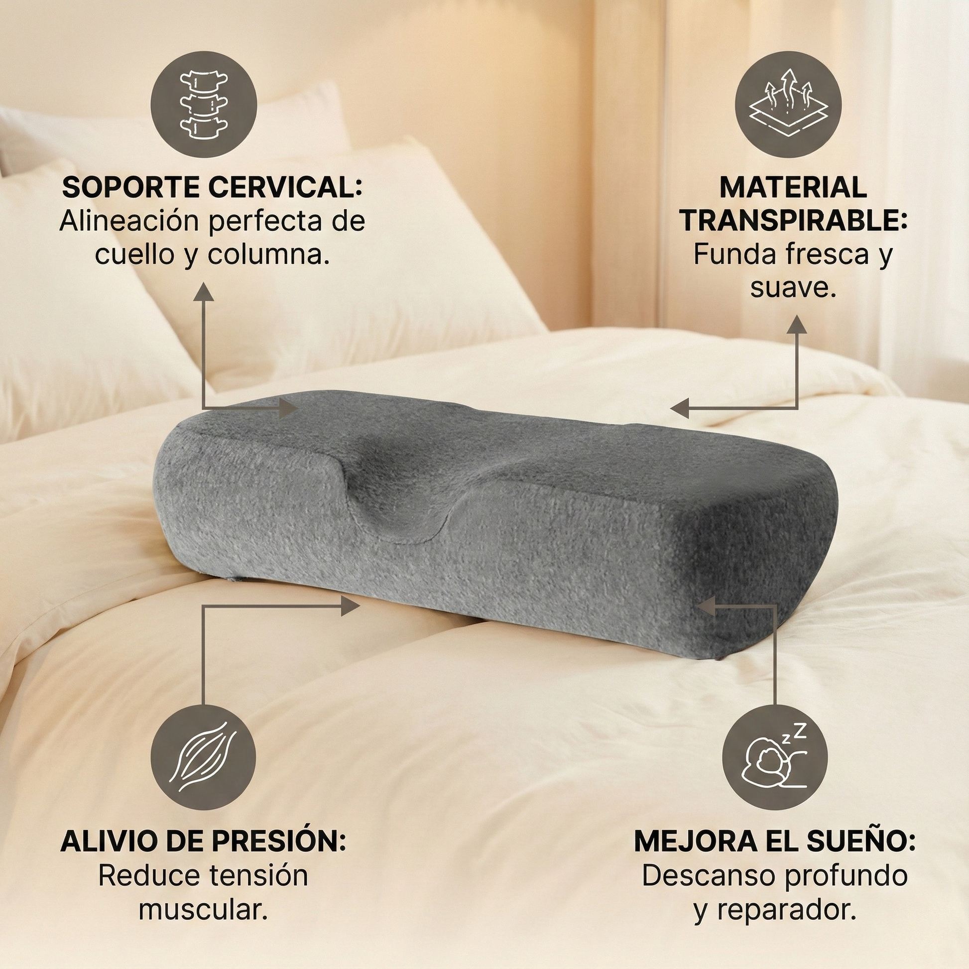 Almohada cervical viscoelástica: contorno que mantiene la cabeza y el cuello en una posición más alineada mientras duermes. La visco se adapta a la forma de tu cuello sin hundirse como una almohada blanda ni sentirse como un bloque rígido. Menos tensión en trapecios y menos rigidez matinal.