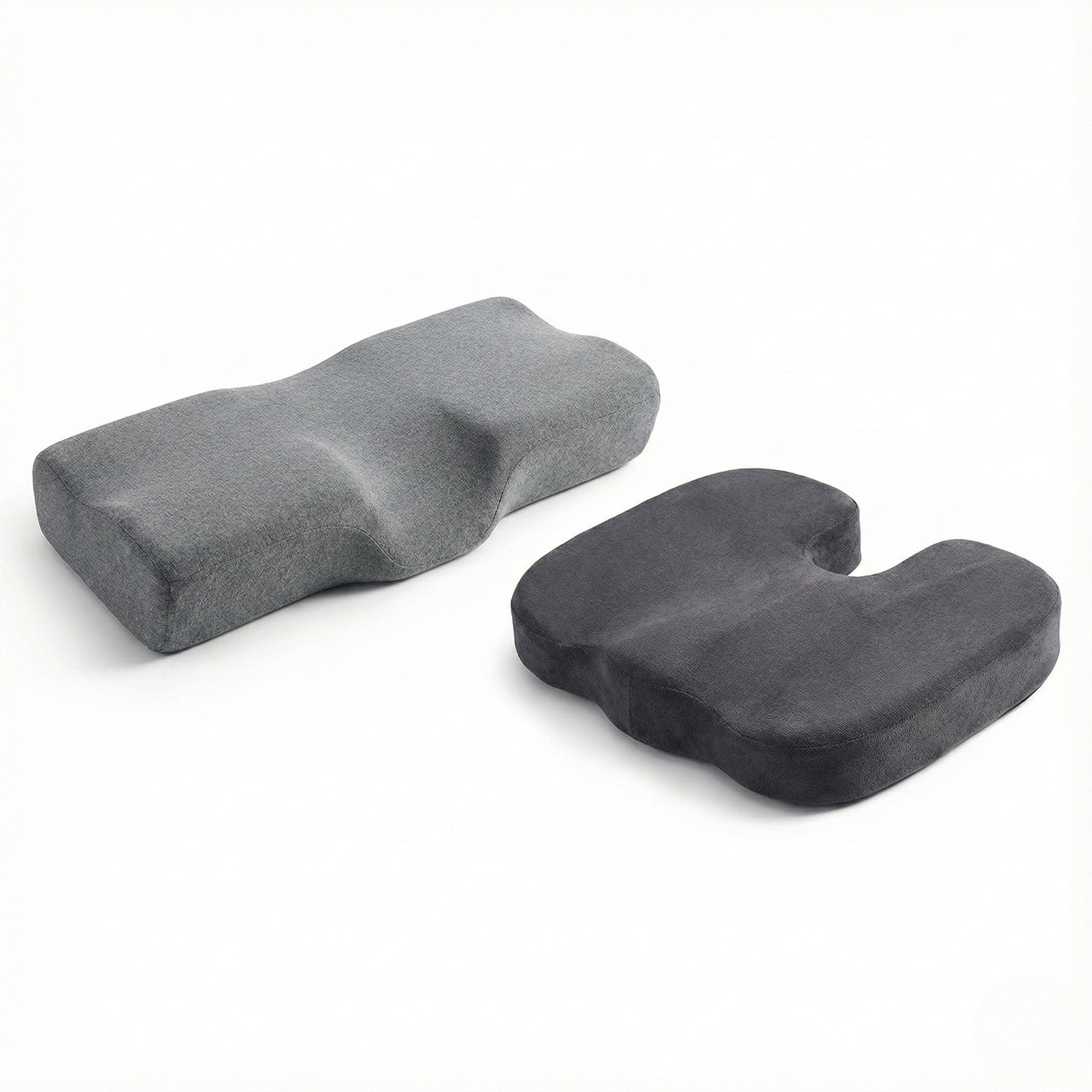Un cojín ortopédico calefactable para el coxis y la zona baja, y una almohada cervical viscoelástica para cuello y cabeza. Están pensados para usarse juntos: uno actúa cuando estás sentado y el otro mientras duermes.
